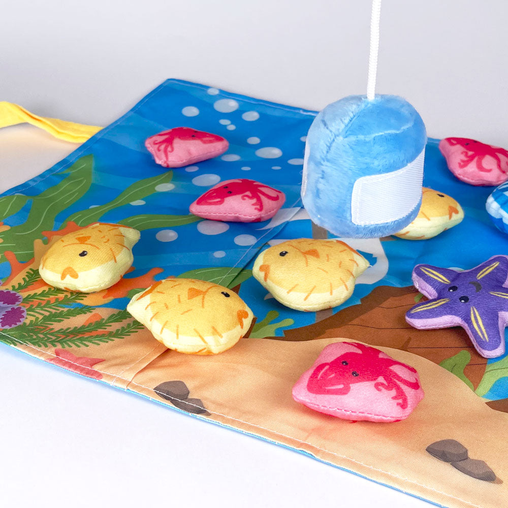A soft and colourful fishing game for babies 6 months+. Little ones can use the plush magnetic rod to "catch" sea creatures and sort them by colour into matching pots, all on a fun ocean play mat!