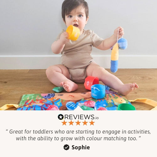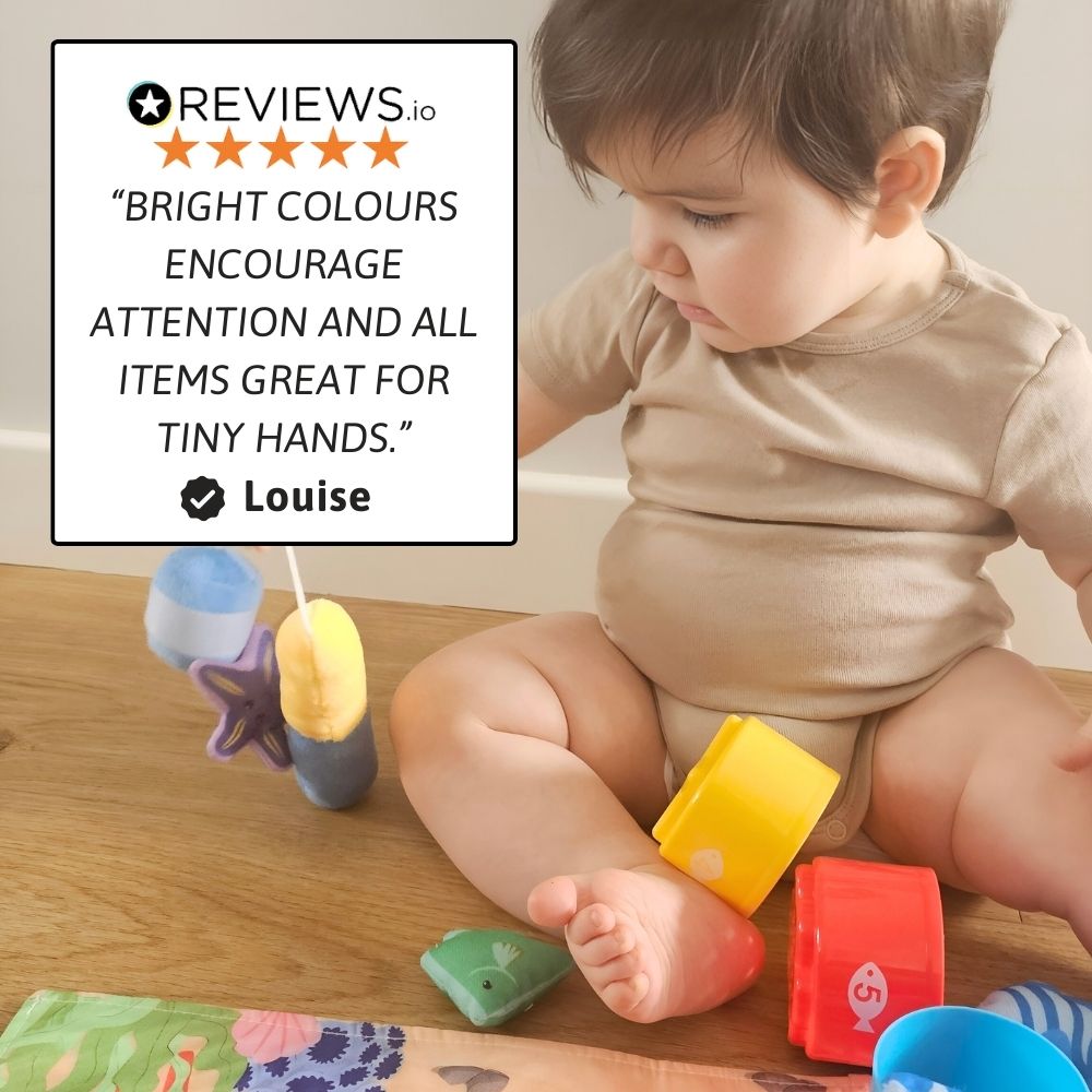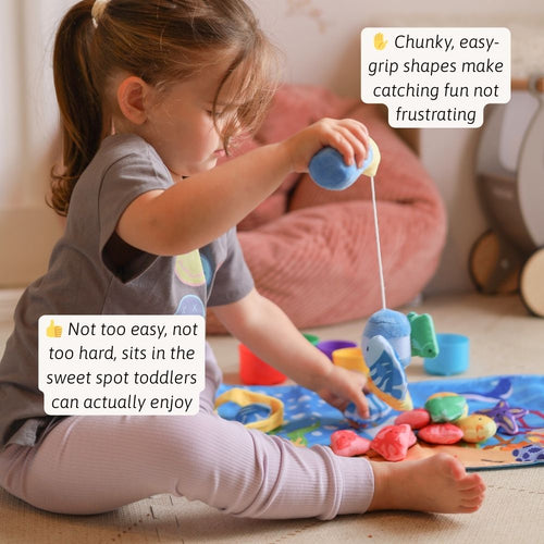 A soft baby fishing toy designed for little hands from 6 months+. It gives babies a fun way to practise grabbing, pulling and sorting while keeping play calm and screen free.