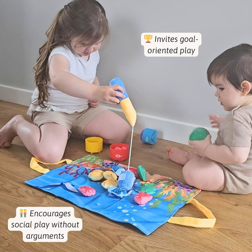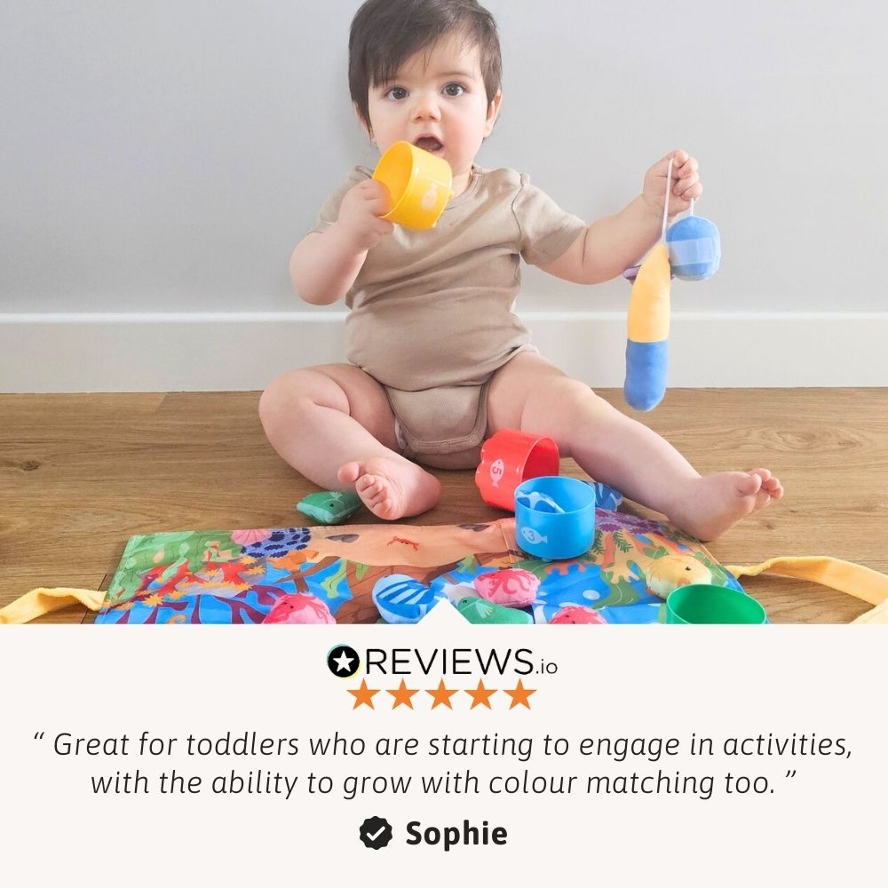 Parents love that the ocean mat doubles as a storage bag, so everything packs away neatly. No loose parts left on the floor, no hard edges, just purposeful play that actually holds their attention.