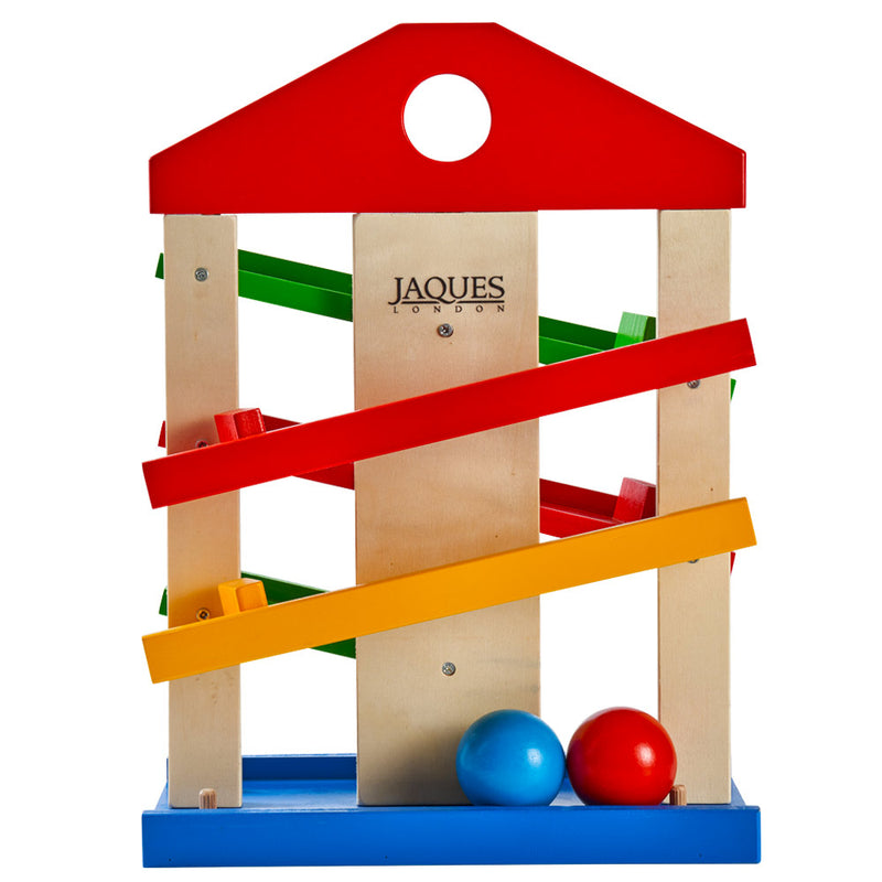 Roll, ring, and race into fun with Jaques of London’s Wooden Ball Track Toy for Toddlers! This exciting Montessori rolling ball toy introduces little learners to motion, gravity, and cause and effect through hands-on play. As each ball speeds down the colourful ramp to ding the bell at the bottom, children build focus, coordination, and curiosity.