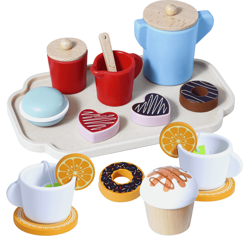 Our Children's Tea Set is more than just a toy; it's a gateway to a world of imaginative play and learning. This delightful tea set encourages role play and helps children develop essential skills. Whether they are hosting a tea party with their favourite stuffed animals or sharing play food with friends, this wooden role-play toy will be a cherished addition to their collection. Explore the magic of pretend play today! A must-have for any little one's toy collection.