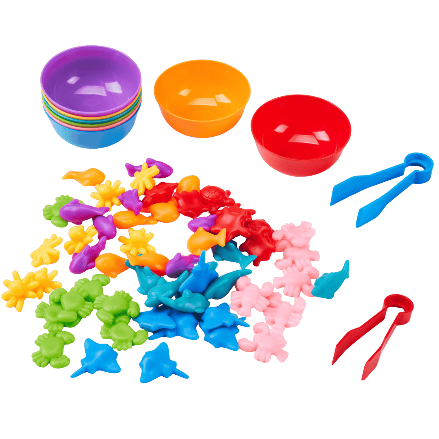- Content Include: 6 uniquely coloured bowls, 56 sea life creatures in 8 different colours and 2 sets of tongs.