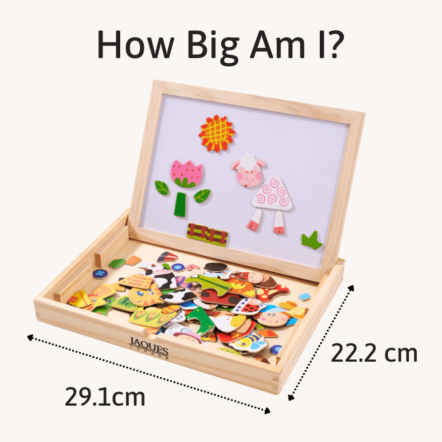 Complete with magnetic farm animal pieces, easy-grip pens and chalk, and a quick-wipe sponge, it’s an ideal mess-free art set for preschoolers and toddlers. Whether used for farm-themed drawing, early mark making, or hands-on fine motor skill play, this portable magnetic art toy is the perfect way to promote creativity while keeping playtime screen-free and joyful. Suitable for ages 3 and up, and beautifully presented in our signature ribbon-tied packaging.