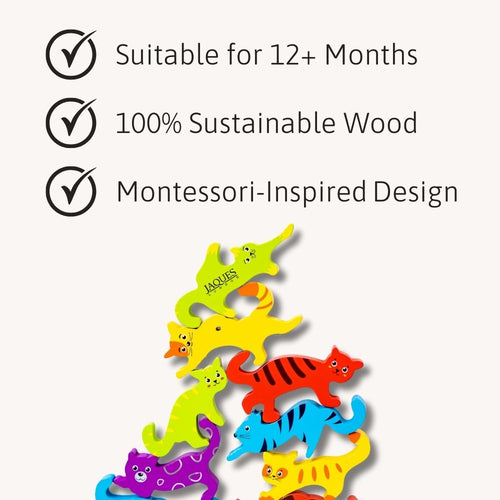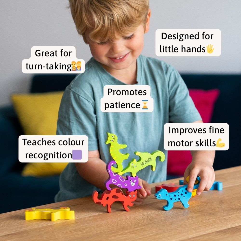 Get ready for hours of stacking fun with the Jaques Crazy Cats! This playful toy helps children develop essential life skills while enjoying a fun challenge. Kids can compete to build the tallest tower or explore different ways to stack their colourful, cat-shaped pieces - perfect for boosting concentration and patience.