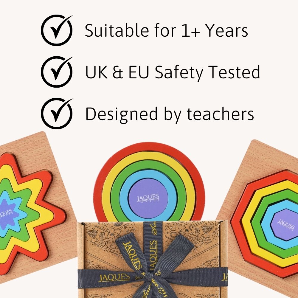 Make learning bright, bold, and fun with the Jaques Rainbow Shape Puzzle Set a vibrant three-in-one wooden puzzle designed to support shape recognition, colour learning, and fine motor development in toddlers and young children.