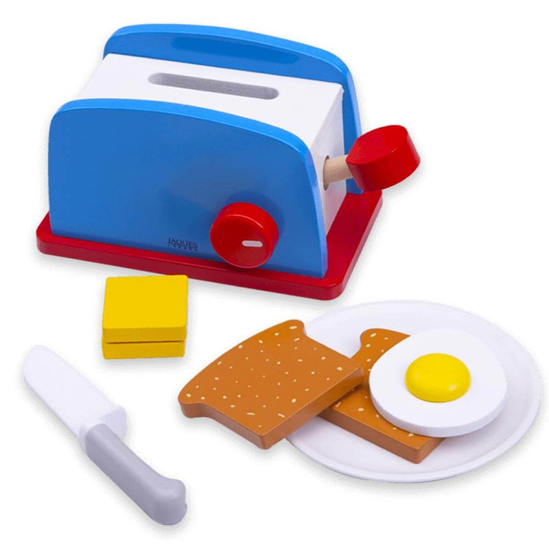Our Let's Pretend Breakfast Set is a top quality addition to our wooden play food sets. It is made of sustainable wood and has water-based paint for safe play. Included in this play food set are 2 slabs of butter, a toaster with working lever for popping your toast up, toast, egg, salt and a plate and toy knife. Toy food for kids built to last!