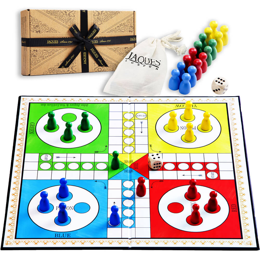 The Ludo 12 inch board game from Jaques is made from good quality & highly durable card and linen and is accompanied by handmade solid wood playing pieces and wooden dice.