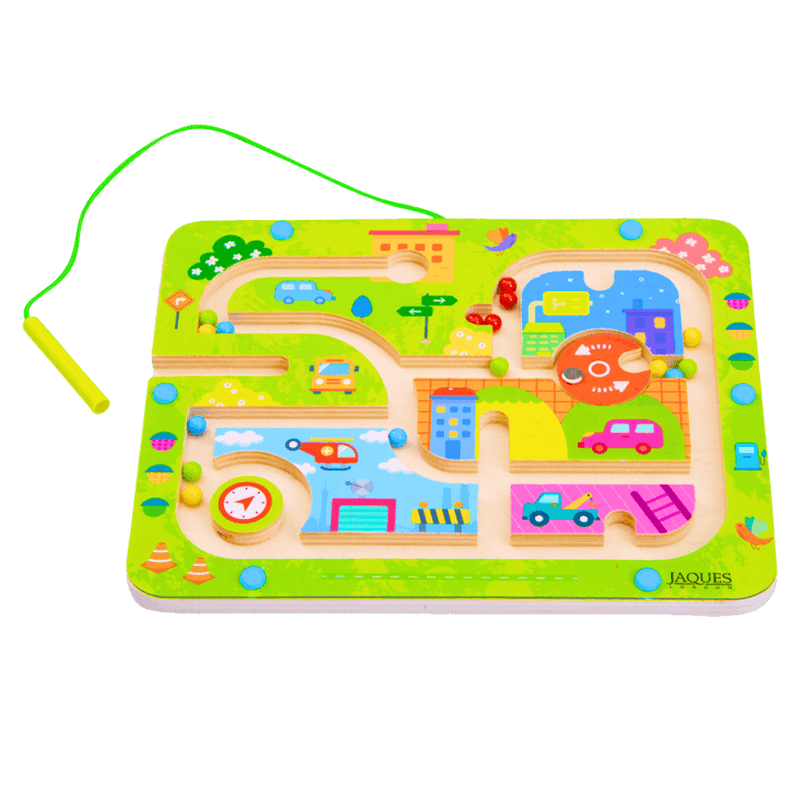 Our colourful magnet maze is a superb activity play set. The set features small magnetic balls in 4 bright primary colours. These are enclosed within a solid wooden frame decorated with urban scenes, including that of a helicopter, bus, traffic light, tow truck, road signs, cones and buildings.