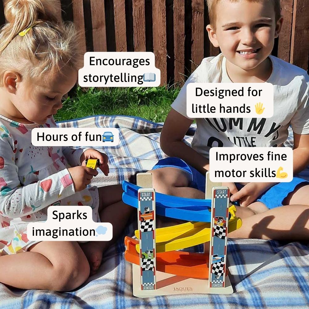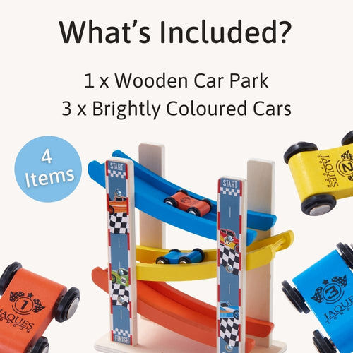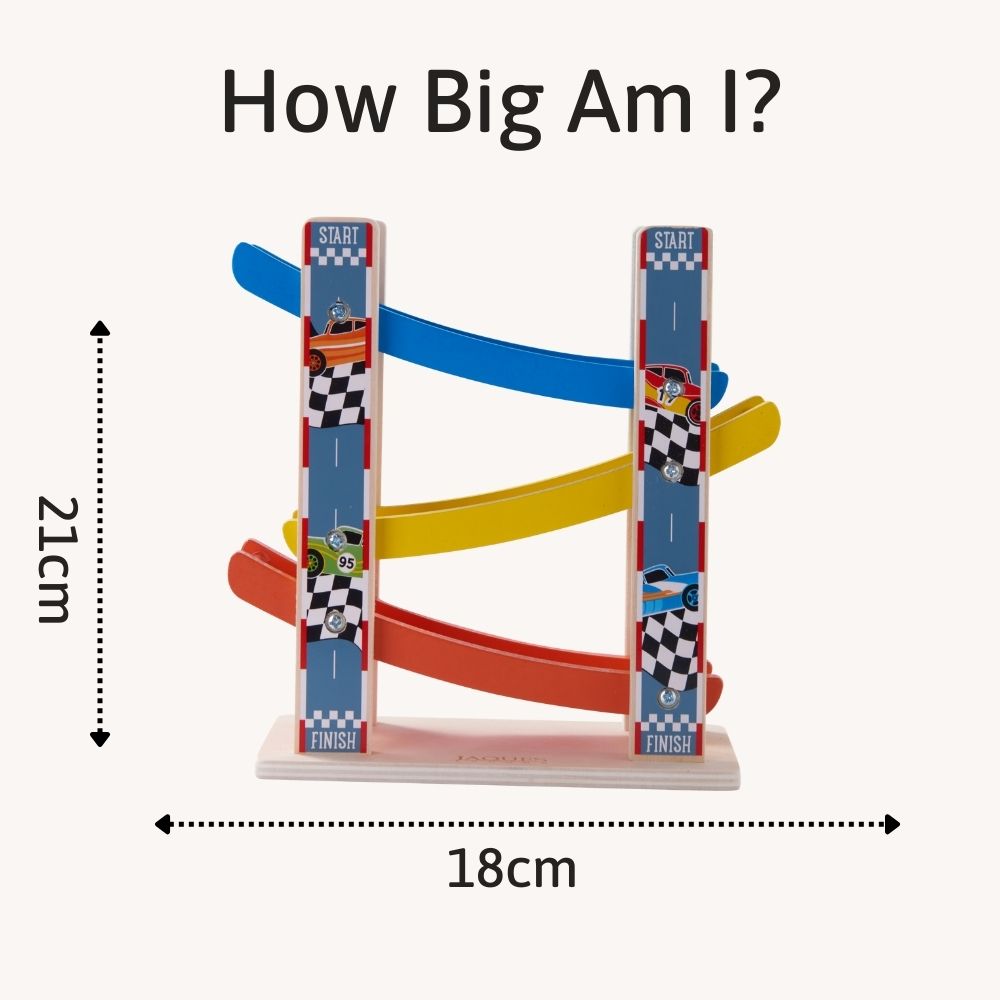 Rev up your little one's imagination with the Jaques Racing Car Park! This exciting toy features three brightly coloured racing cars and a wooden car park with three ramps for endless fun. Let your child race, zoom, and steer their way to victory while building important skills along the way.
