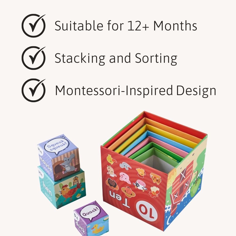 - ⭐ 10 Farm-Themed Nesting & Stacking Cubes Featuring animals, numbers, and playful sounds