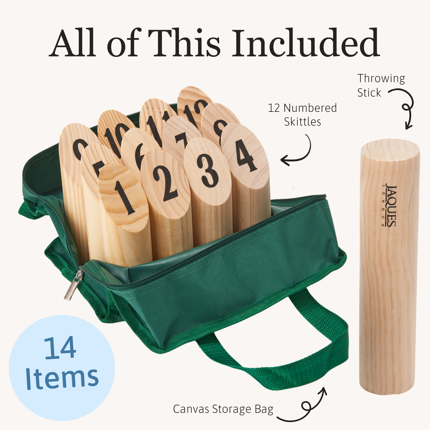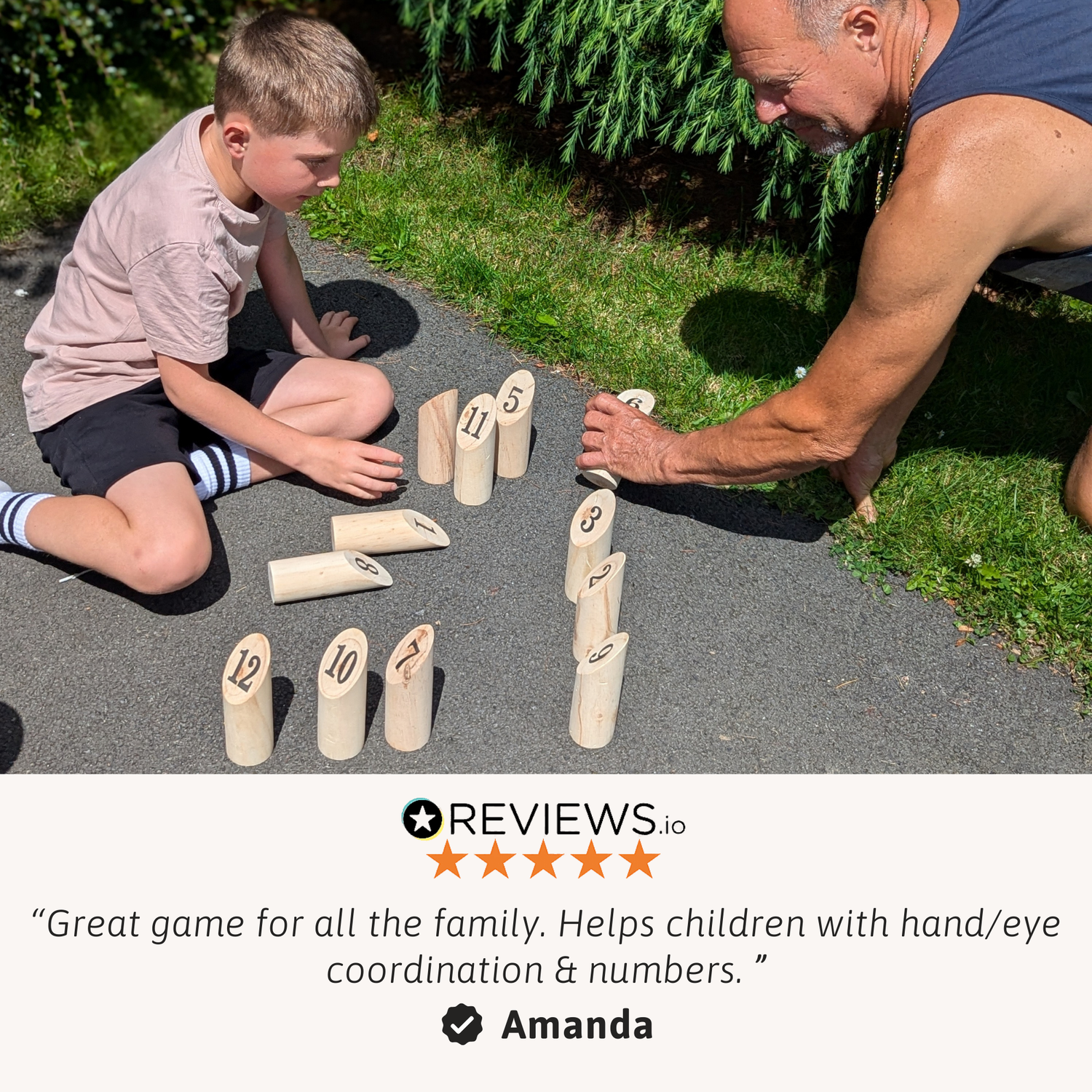 - ⭐ 12 Numbered Wooden Skittles Beautifully turned and made for classic skittles fun