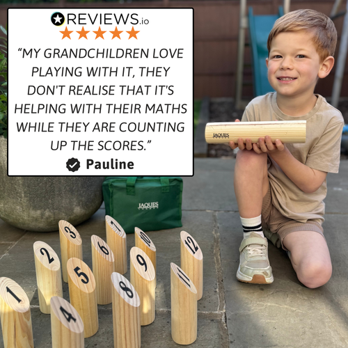 Roll into classic garden fun with Jaques of London’s Wooden Skittles Game, the perfect wooden garden game for the whole family to enjoy. This beautifully hand-crafted wooden bowling set is ideal for summer play, whether you’re at home, in the park, or heading off on a holiday. Designed for kids and loved by grown-ups, this outdoor toy for kids encourages physical play, coordination, and competitive fun.